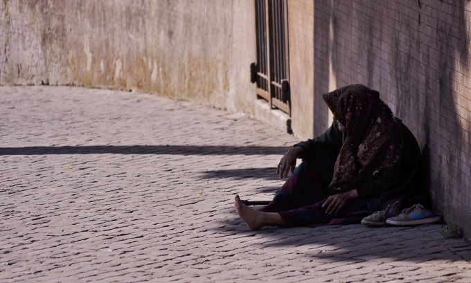Imagine a homeless guy sitting on the street. Around him, people are passing by.