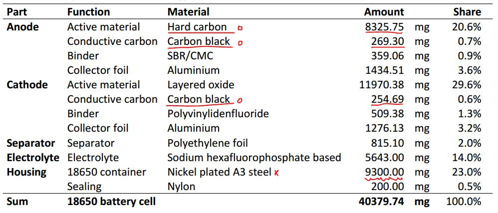 But, let’s consider batteries. Below in table you will find typical content of the Li-Ion battery. To simplify calculation we will approximate that typical content of carbon in one 18650 cell is 10 g (in table entire cell weight is 40 g, but typically 18650 cell weight is around 45 grams).