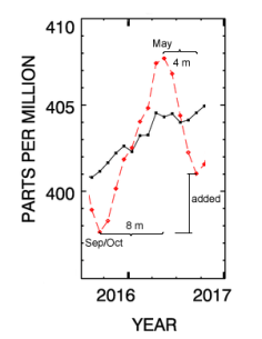 In May, when plants turn green again, with the help of sunlight and photosynthesis, they pull the CO2 from the atmosphere.