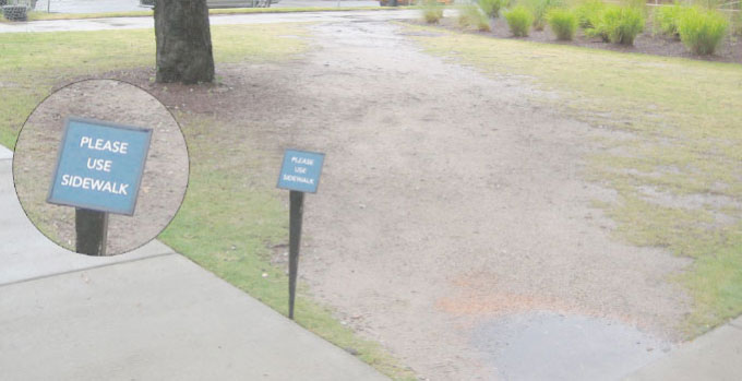 The fence must be adjusted for the type of user; what may pose an extra effort for the walker may not represent any significant obstacle for the runner. Runners, because they experience an additional stress on joints, usually prefer grass/dirt over concrete surfaces. So, a fence height above the knees may suffice for walkers, but, for runners, the fence needs to be raised to chest level or above. Keeping that in mind, at some point, there will be a gate/passage in the fence, and runners will use that passage, over time creating a footpath and destroying the grass in the process, as can be seen in the following image. Therefore, a fence is not a good solution either.
