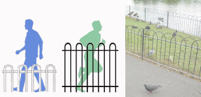 One of the ideas to prevent pedestrians walking over green surfaces would be to create a fence. A fence, high enough to create additional effort that feels like a jumping over, is a larger effort than staying on the track. At the same time, the fence must discourage attempts to sit on it, but a fence in a park must not have any type of spikes or open bars that could cause accidental injuries. Its only reason for existence is to prevent a majority of “users” jumping over and making footpaths by constantly walking over the same path.