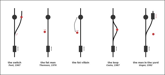 On the tracks ahead, there are five people tied up and unable to move. The trolley is headed straight for them. You are standing some distance off in the train yard, next to a lever. If you pull this lever, the trolley will switch to a different set of tracks. However, you notice that there is one person on the side track. You have two options: Do nothing and the trolley kills the five people on the main track or, pull the lever and divert the trolley onto the side track where it will kill one person.