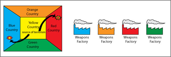 The Blue and Red countries were already involved, in one way or another, in military actions against militant groups of the Yellow country. Militants from the Yellow country seeking revenge make occasional attacks within neighbor countries but mainly attack the civilian population, causing panic and unrest. The media in all the neighbor countries disturb the masses, calling in panic for military actions. This propaganda loop is suitable for the weapons industry, because now everyone needs more ammo and more guns, as all countries are involved in war. Even countries that were not involved previously are afraid of terrorism and willingly agree to join in action against the threat.